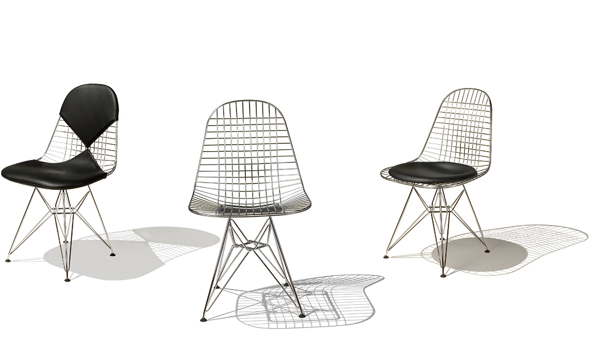 Charles & Ray Eames 1951 年發表的 Wire Chair 系列,以一片式有機網狀椅座,延伸變化出一系列不同椅腳及座墊搭配的單椅,這系列椅款輕巧透明的設計,在 60 年代可說是運用了當時最先進的技術來製作,靈感則是來自於鏤空的金屬收納籃,金屬條交織的椅座,彎曲的弧面不僅符合人體工學,在視覺上更具有穿透性。