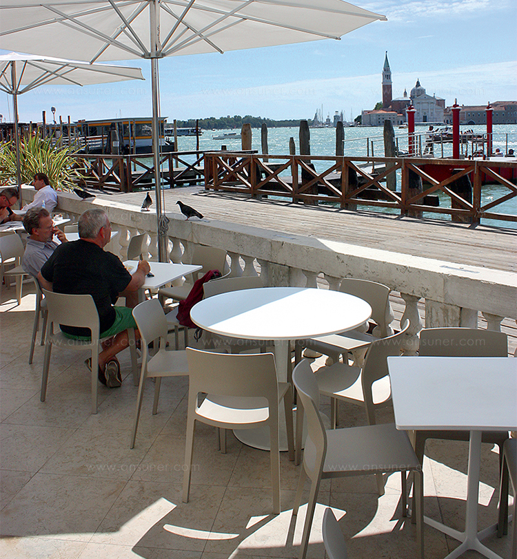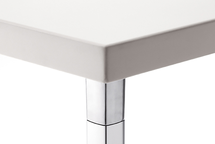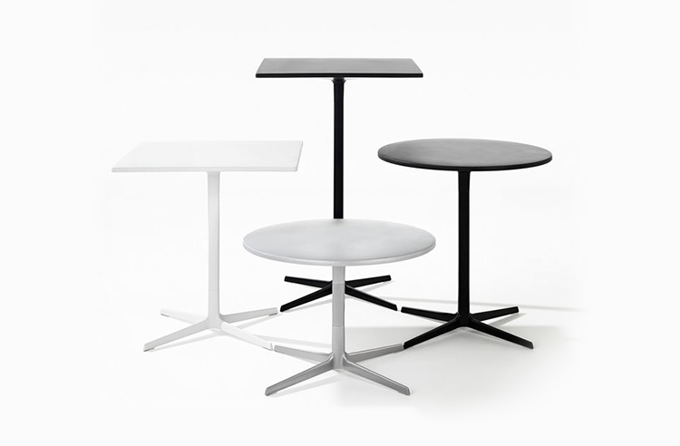 有四种高度(36.4,50,74和105厘米)可供选择,圆形和方形顶部有各种尺寸。 四星级底座采用闪亮或白色涂层铝制成。