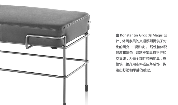 由Konstantin Grcic为Magis设计,休闲家具的交通系列提供了对比的研究:硬和软,线性和体积,俏皮和复杂。 钢制杆架具有平行和交叉线,为每个部件带来能量。 靠垫块,整齐地用布料或皮革装饰,传达出舒适和平静的感觉。