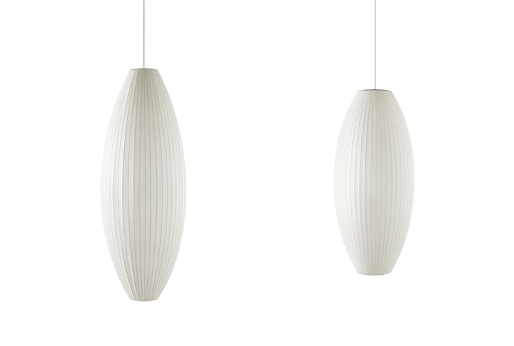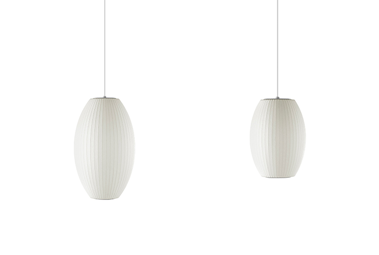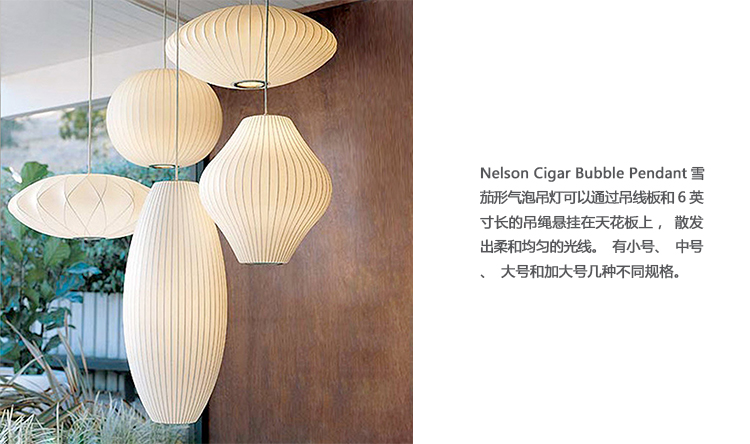 Nelson Cigar Bubble Pendant雪茄形气泡吊灯可以通过吊线板和6英寸长的吊绳悬挂在天花板上,散发出柔和均匀的光线。有小号、中号、大号和加大号几种不同规格。这些灯具最初生产于1952年,当时Nelson看到一组配有精心制作的丝质灯罩的瑞典吊灯,由此触发灵感。然而,吊灯的价格实在让人望而却步。Nelson决定设计制作自己的灯组,并且想出了用透明塑材代替真丝的创新工艺,使其能拥有更实惠的价格。