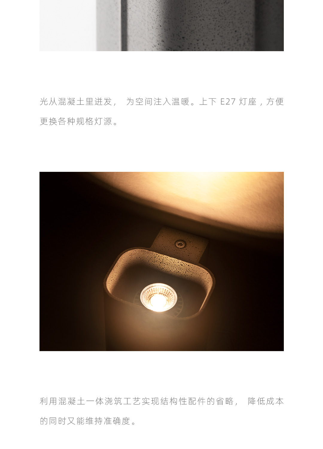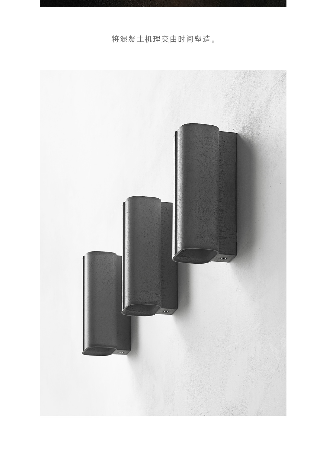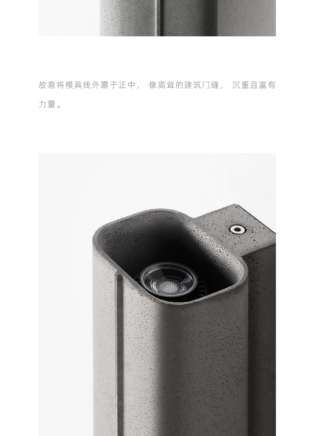 探索混凝土的可能性,模糊建筑材料与工业材料的界限。全混凝土壁灯,产品与建筑融为一体,根植于空间,是光影的载体,是建筑的延伸。