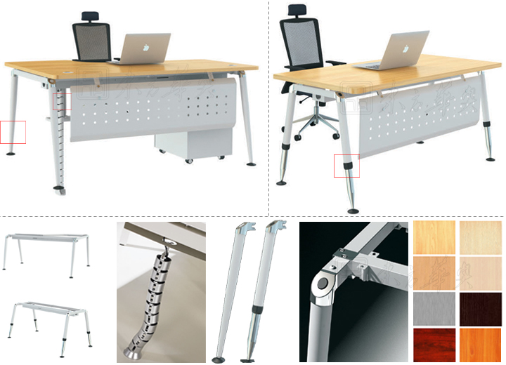 ※  上图是两款类似办公桌细节展示,椅脚可分为固定和可升降调节,配置时尚脚垫,防滑防刮伤,桌面配置蛇形管,可以防止线路搭乱现象,时尚现代表现的淋漓尽致,搭配喷塑白色,清爽,简洁!