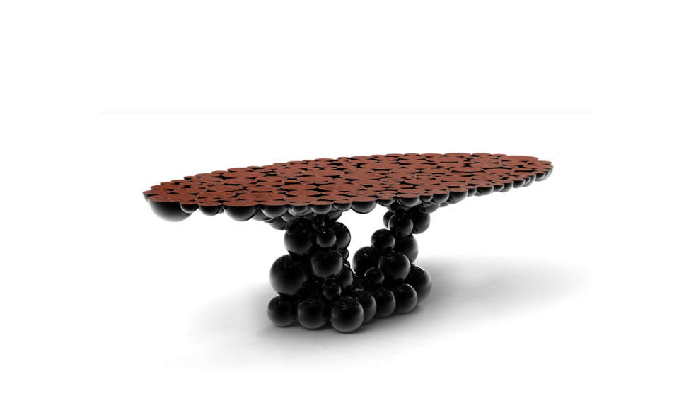 We are still working hard on new challenges for artisans and designers; new techniques, materials and concepts are still being tested now it’s a “MOMENTUM”. Newton is our truly moment of inspiration, a table completed by spheres and semi spheres that joined together complete this dining table with this exquisite look. Inspired in Newton’s law of gravity, we were looking for an object capable to reflect the sphere attraction as they were joined with their mass, force and energy. This table is ideal for 8 to 10 people who will be amazed when gracing this masterpiece at your home. Techniques as casting, lacquering or varnishing, are used in this table, with materials as myrtle burl veneer, walnut root veneer and aluminum. This table has three different versions and all of them present amazing different combinations.
