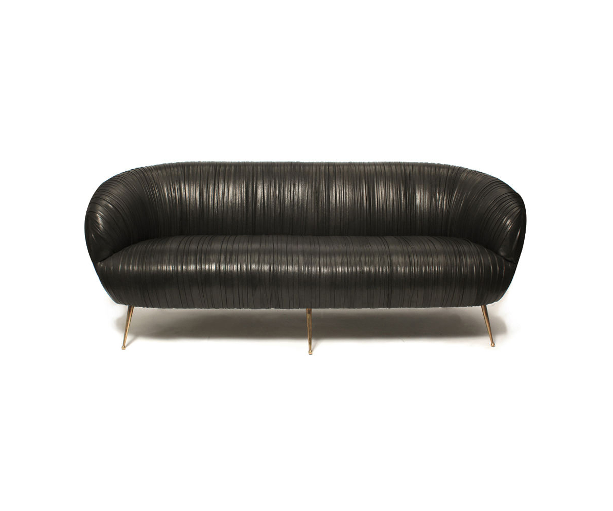 这款沙发的精致线条采用标志性褶皱皮革细节设计。 窑干硬木框架采用双榫和胶合,配有8向手工弹簧。 全面的蔬菜染色小羊皮手工缝制在框架上。 这款精致细腻的豪华沙发坐落在坚固的青铜铸造的锥形腿上。 完美适合厨房长椅,客厅或床边。