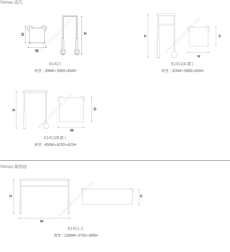 Nimes 鸡尾酒桌 系列尺寸/示意图