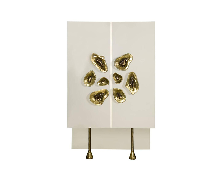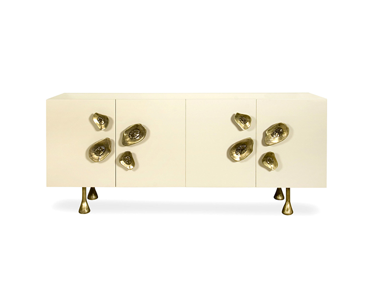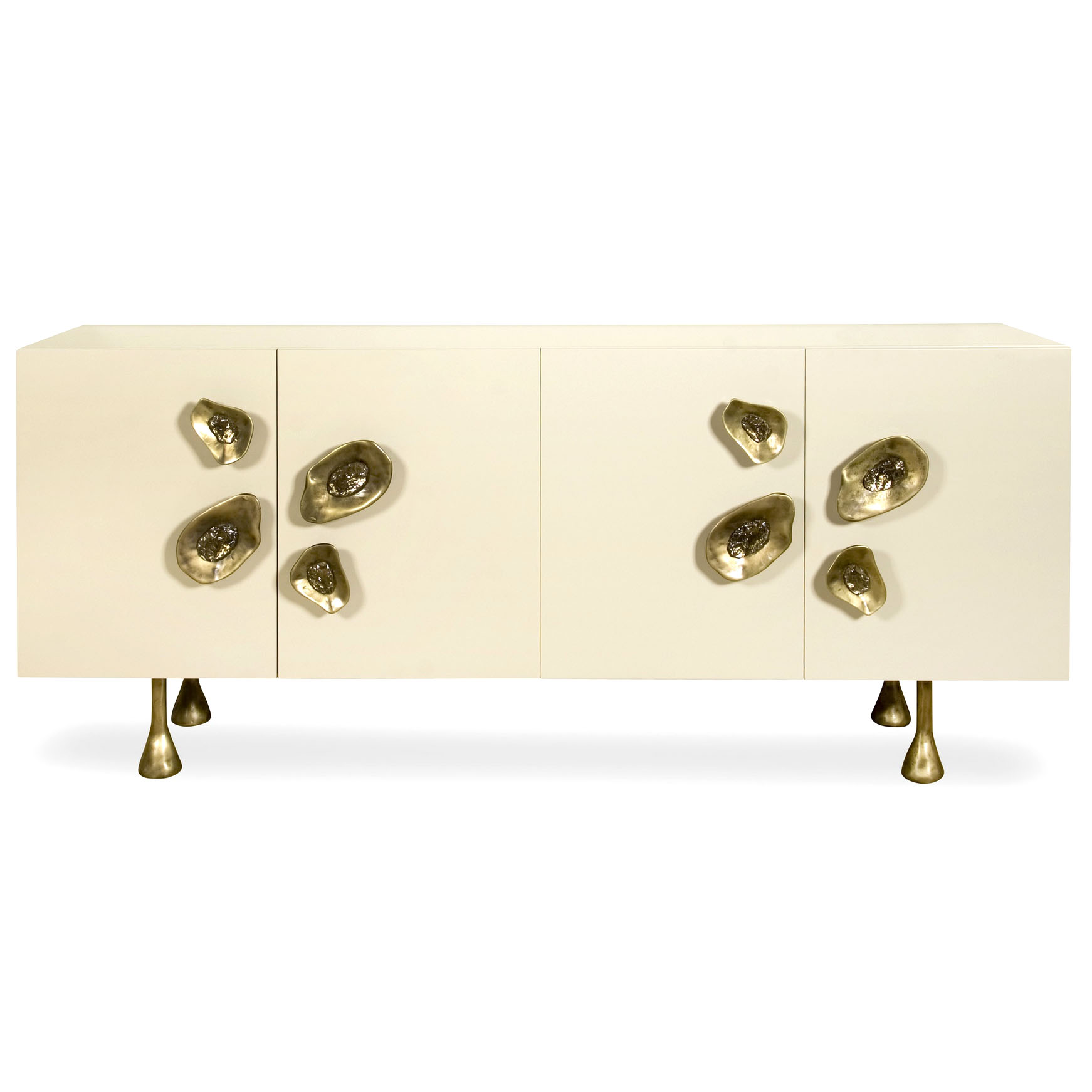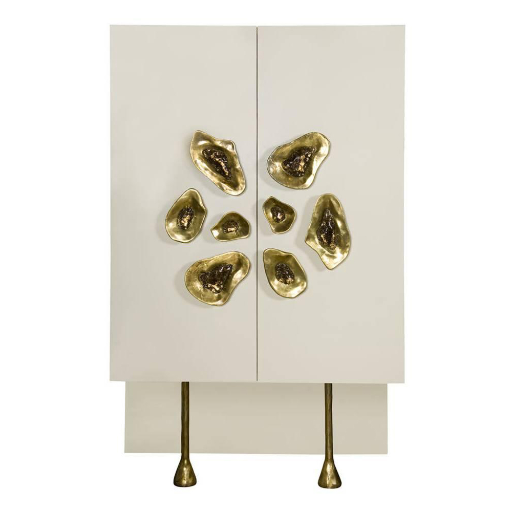 Crescent书橱的超大雕塑装饰为这款大型控制台带来丰富而不可否认的优雅气质。 坚固的美国胡桃木表壳,采用华丽的象牙色漆面漆制成,有铸造黄铜腿。 正面采用实心黄铜制成,带有手工切割的铸造玻璃中心。 内部设有四个浅抽屉,带有柔软的紧密硬件和手工雕刻的黄铜拉手,以及两个内部坚固的切割胡桃木架子。 天然胡桃木内饰,抛光黄铜抽屉拉,黄铜门拉和腿,碎玻璃。