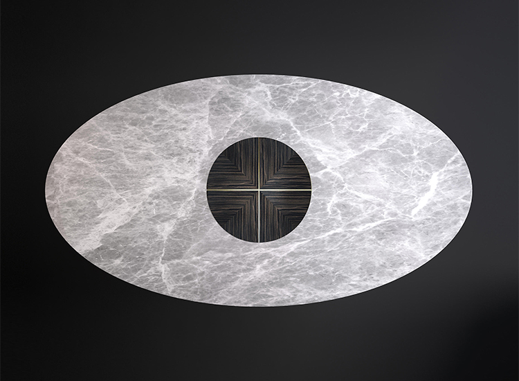 华丽华丽的桌子;木质结构支撑着椭圆形的灰色大理石桌面。同样的装饰让人想起顶部的图案,薄薄的黄铜条交织在一起,呈现出不同寻常的优雅。实体空间和空洞空间的交替与顶部的坚固性相矛盾,确实带来了意想不到的轻盈感。
