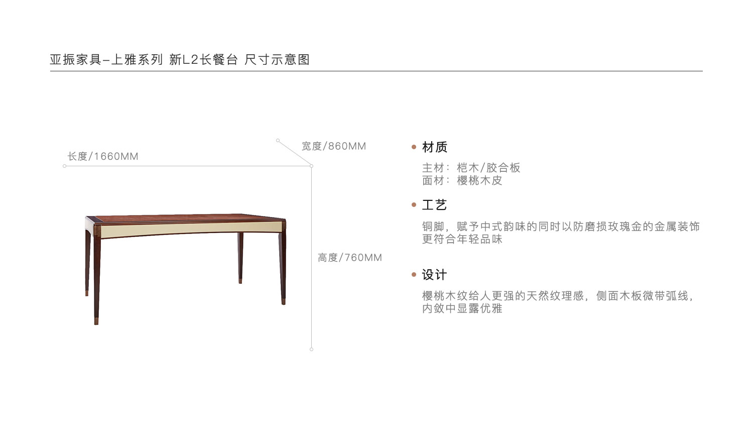 铜脚,赋予中式韵味的同时以防磨损玫瑰金的金属装饰更符合年轻品味。樱桃木纹给人更强的天然纹理感,侧面木板微带弧线,内敛中显露优雅。