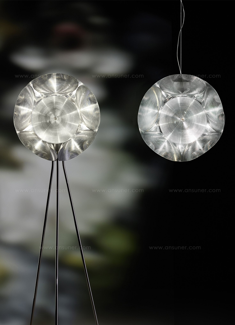 在常规十二面体的每一侧,Hutten都放置了一个圆形反射器。 结果是一个有趣的3D对象,你看到的每个角度不同变化。 丰富的物体,为空间提供了大量的氛围。 无论是悬挂版还是落地版。