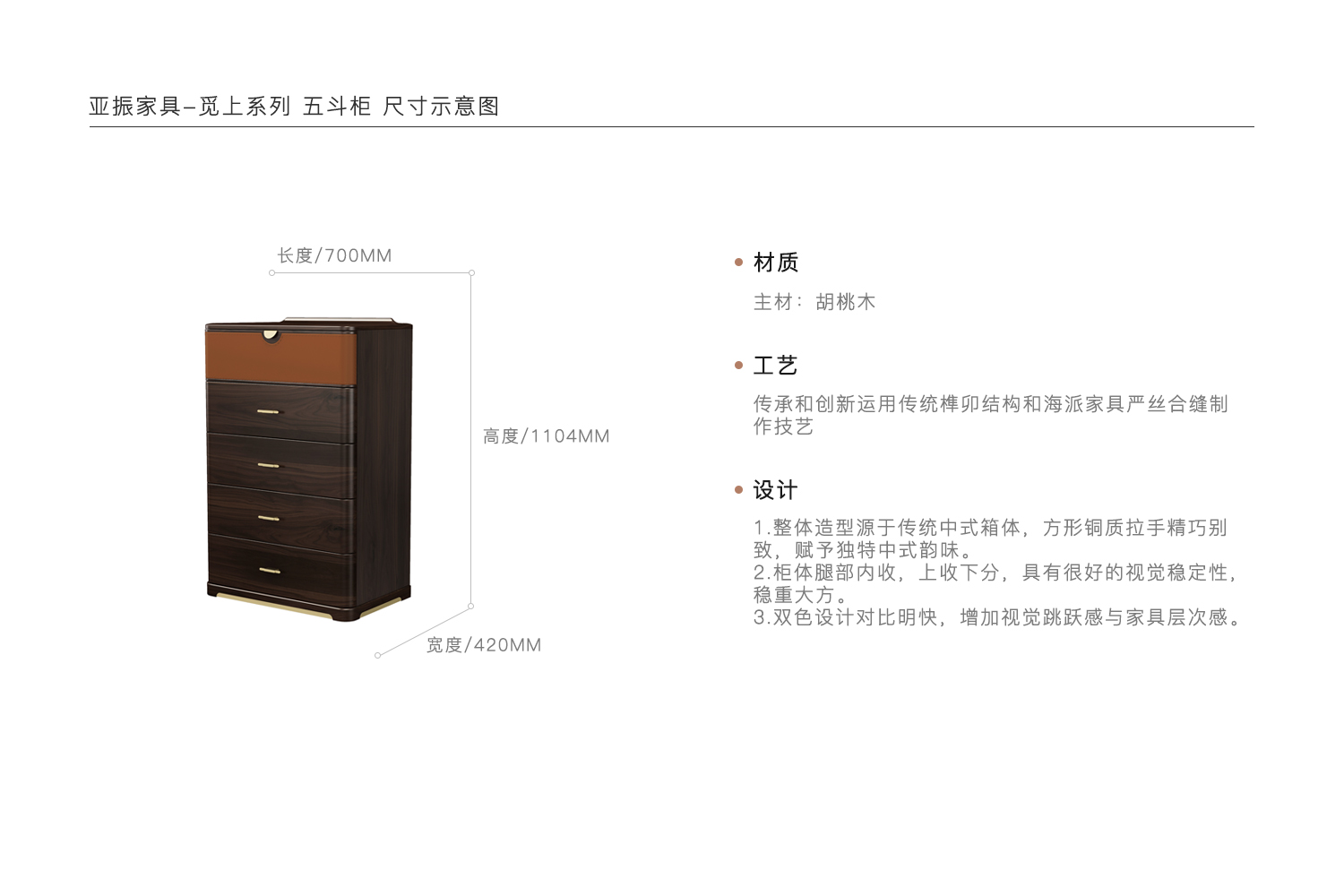 1.整体造型源于传统中式箱体,方形铜质拉手精巧别致,赋予独特中式韵味。 2.柜体腿部内收,上收下分,具有很好的视觉稳定性,稳重大方。 3.双色设计对比明快,增加视觉跳跃感与家具层次感。