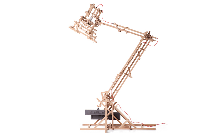"in a brave new world imagination is free to produce a complex lamp with simple materials, translating the warm soul of the oak wood in a mechanic way.""the brave new world lamp by design duo fresh west started as a concept piece of random thought-initiated construction. Following the example of old far eastern bamboo scaffolding or simply of our childhood meccano creations, the brave new world lamp was developed without a design or plan in place. Nevertheless each piece of wood is carefully notched and pegged together to form an integral part of the overall mechanical structure." Material: Oak frame and cast iron balancing weights"