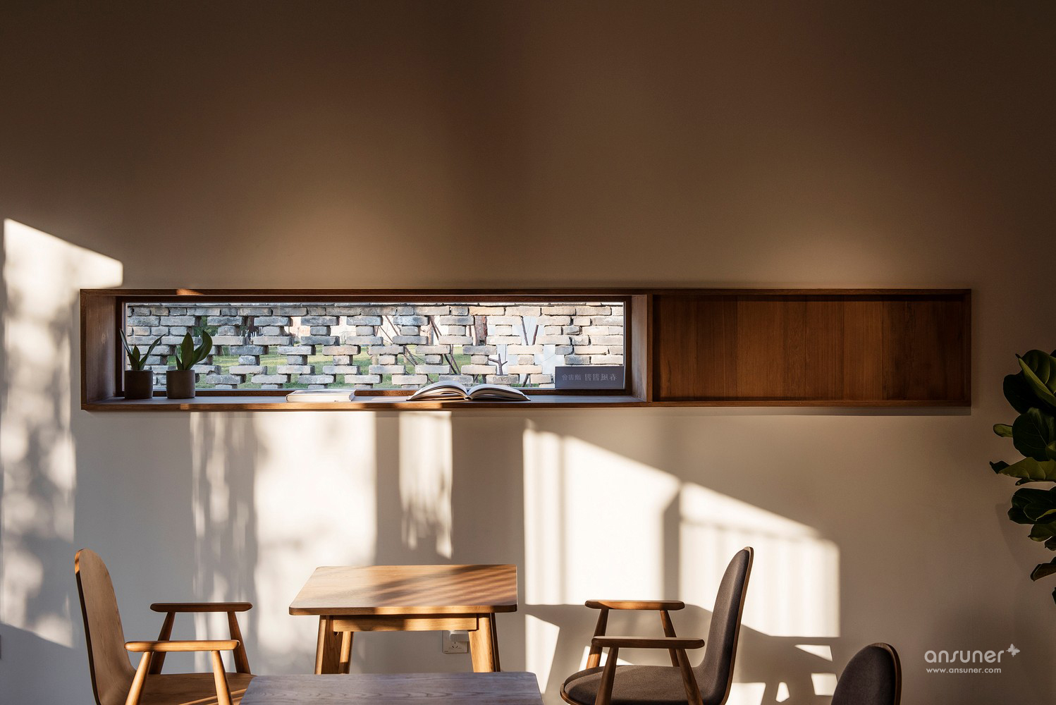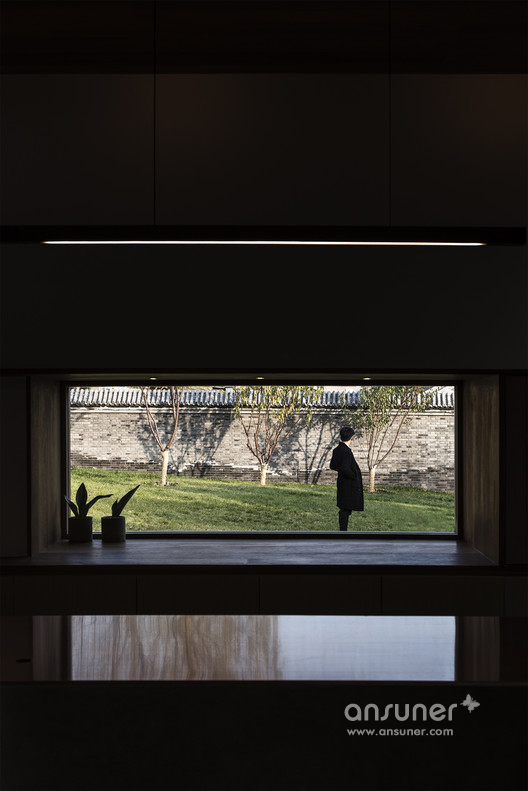 在灰色水磨石的连接下,沿河的立面用节奏较为舒缓的矩形体块排布开来。其中主入口连接了室内吧台区域,将它们组合在一个盒子当中嵌入房间,形成了简洁明确的功能划分。为书籍展示和阅读讨论设计的大工作桌放置于敞亮的玻璃窗旁,停留在此能感受饱满和谐的阳光和窗外恰到好处的小河垂柳。西侧格栅折叠窗设计巧妙地在回应传统装饰语言的同时也可用于夏日遮阳。