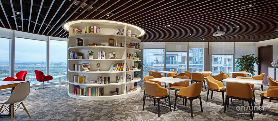 环形全落地窗、视线开阔、空间宽敞明亮。可同时容纳全体员工,兼具活动、茶歇、书吧、讨论等功能。