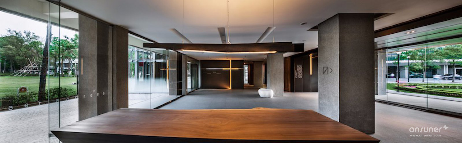 轴长条形的建筑物,循着梁柱结构的痕迹勾勒出长短两向轴线。短向轴线连结前后绿带草坪,长向轴线使左右两侧空间遥望对话。