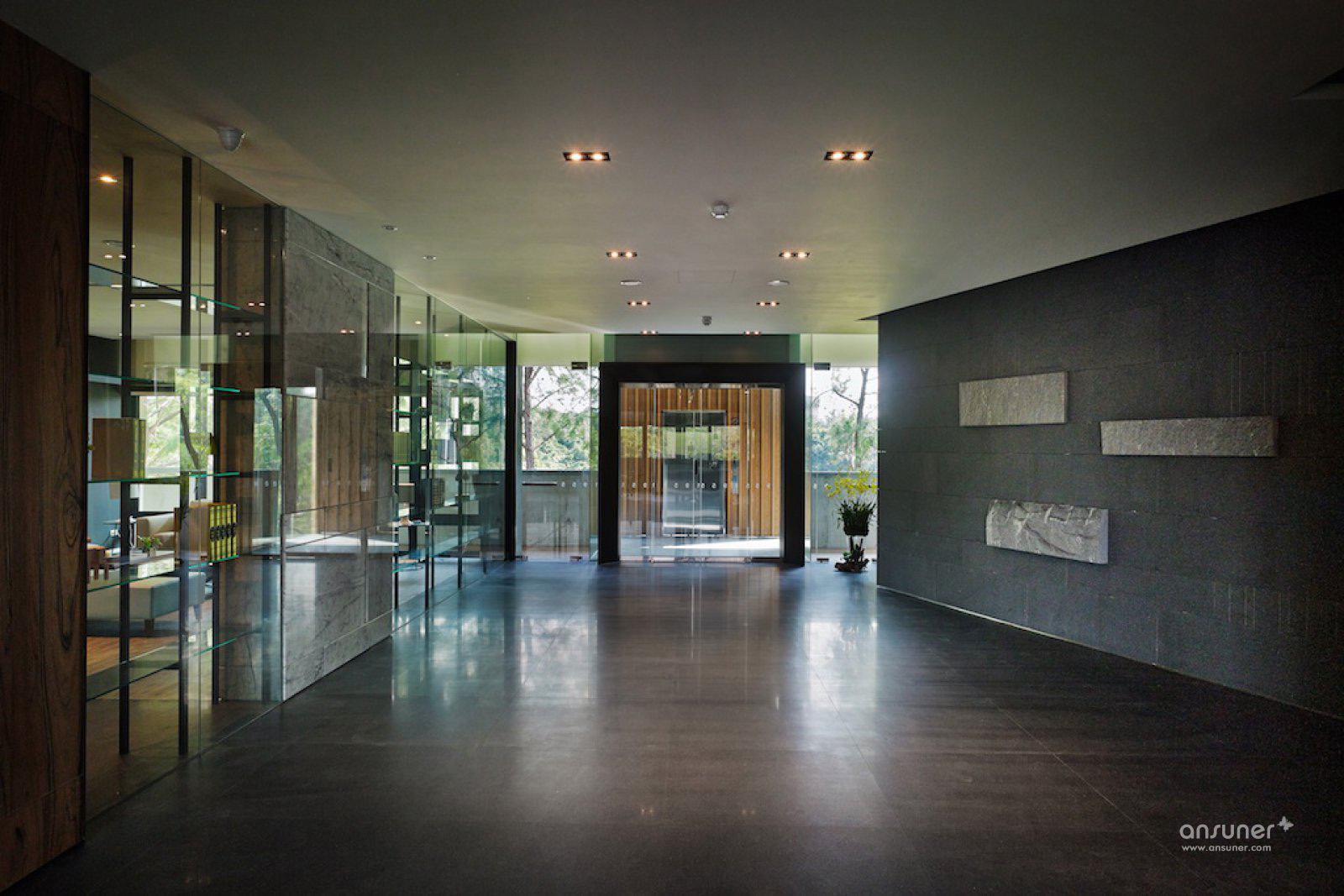 柱顶及长廊墙上的间接灯光溢流而下,柱子与墙的边界消失在天花板内。